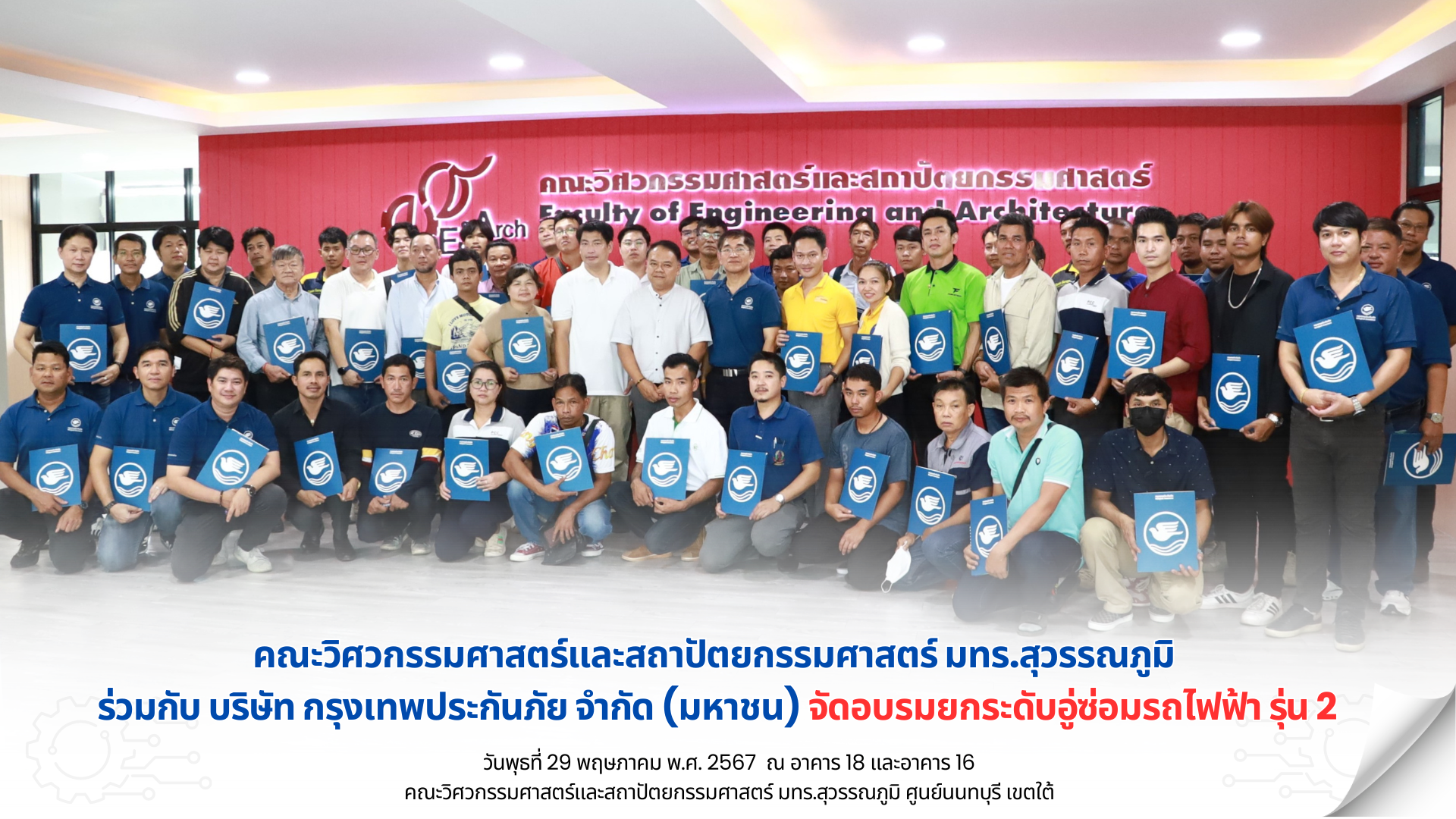 วันพุธที่ 29 พฤษภาคม พ.ศ. 2567 สาขาวิชาวิศวกรรมเครื่องกล คณะวิศวกรรมศาสตร์และสถาปัตยกรรมศาสตร์ มหาวิทยาลัยเทคโนโลยีราชมงคลสุวรรณภูมิ ร่วมกับบริษัท กรุงเทพประกันภัย จำกัด (มหาชน) จัดโครงการฝึกอบรม“การเตรียมความพร้อมเพื่อยกระดับอู่ในสัญญาสำหรับงานซ่อมรถไฟฟ้า รุ่นที่ 2” ณ อาคาร 18 และอาคาร 16คณะวิศวกรรมศาสตร์และสถาปัตยกรรมศาสตร์ มทร.สุวรรณภูมิ ศูนย์นนทบุรี เขตใต้ มีเป้าหมายเพื่อพัฒนาความรู้และเสริมทักษะให้กับเจ้าของอู่ ผู้บริหาร ผู้จัดการ วิศวกร โฟร์แมน หัวหน้างาน ช่างเทคนิค พนักงาน และบุคลากรในเครือบริษัท กรุงเทพประกันภัย จำกัด (มหาชน)
