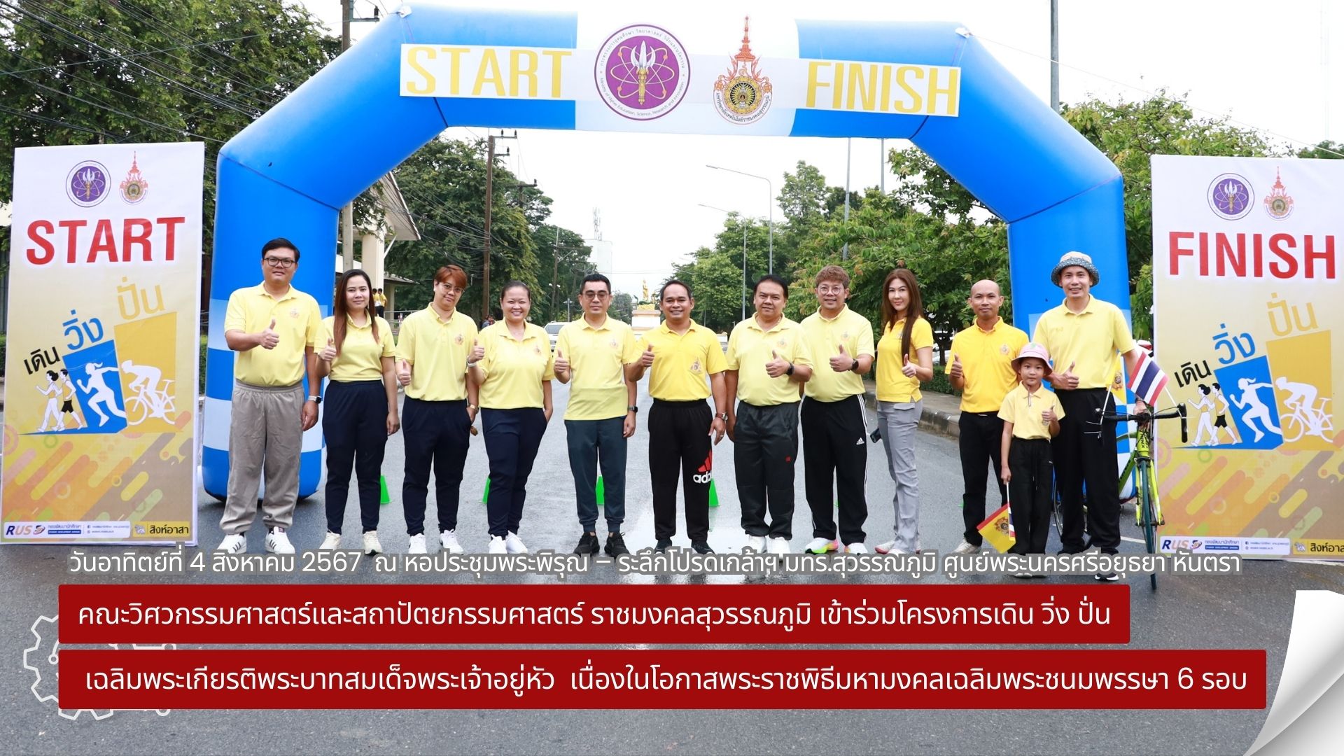 วันอาทิตย์ที่ 4 สิงหาคม 2567 มหาวิทยาลัยเทคโนโลยีราชมงคลสุวรรณภูมิ นำโดย รองศาสตราจารย์ ดร.ประมุข อุณหเลขกะ อธิการบดี เป็นประธานเปิดโครงการ “เดิน วิ่ง ปั่น” เฉลิมพระเกียรติพระบาทสมเด็จพระเจ้าอยู่หัว เนื่องในโอกาสมหามงคลเฉลิมพระชนมพรรษา 6 รอบ ณ หอประชุมพระพิรุณ – ระลึกโปรดเกล้าฯ มทร.สุวรรณภูมิ ศูนย์พระนครศรีอยุธยา หันตรา โครงการนี้จัดขึ้นเพื่อเพื่อตอบสนองแนวทางในการจัดกิจกรรมเฉลิมพระเกียรติของของกระทรวงการอุดมศึกษา วิทยาศาสตร์ วิจัยและนวัตกรรม (อว.) และส่งเสริมให้บุคลากร นักศึกษา และประชาชนที่สนใจ ได้ออกกำลังกายเพื่อให้มีพลานามัยที่แข็งแรงตามพระราชปณิธาน ในการนี้ ผู้ช่วยศาสตราจารย์พัชระ กัญจนกาญจน์ คณบดีคณะวิศวกรรมศาสตร์และสถาปัตยกรรมศาสตร์ พร้อมด้วยผู้บริหาร คณาจารย์ เจ้าหน้าที่ และนักศึกษา ได้เข้าร่วมกิจกรรมฯ ด้วยความพร้อมเพรียง อีกทั้งยังเป็นการน้อมนำตามพระราชปณิธานในการสร้างสังคมที่เข้มแข็งและมีสุขภาพดีต่อไป