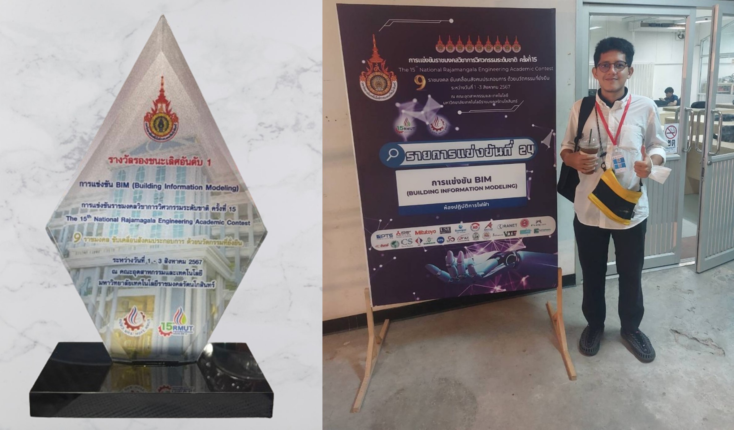 - ประเภทการแข่งขัน BIM (Building Information Modeling) โดยนายธนวินท์ เซี่ยงจง นักศึกษาชั้นปีที่ 5 สาขาวิชาสถาปัตยกรรม ซึ่งมีอาจารย์เชิงชาญ แสงวิสุทธิ์ เป็นอาจารย์ผู้ควบคุมทีม
