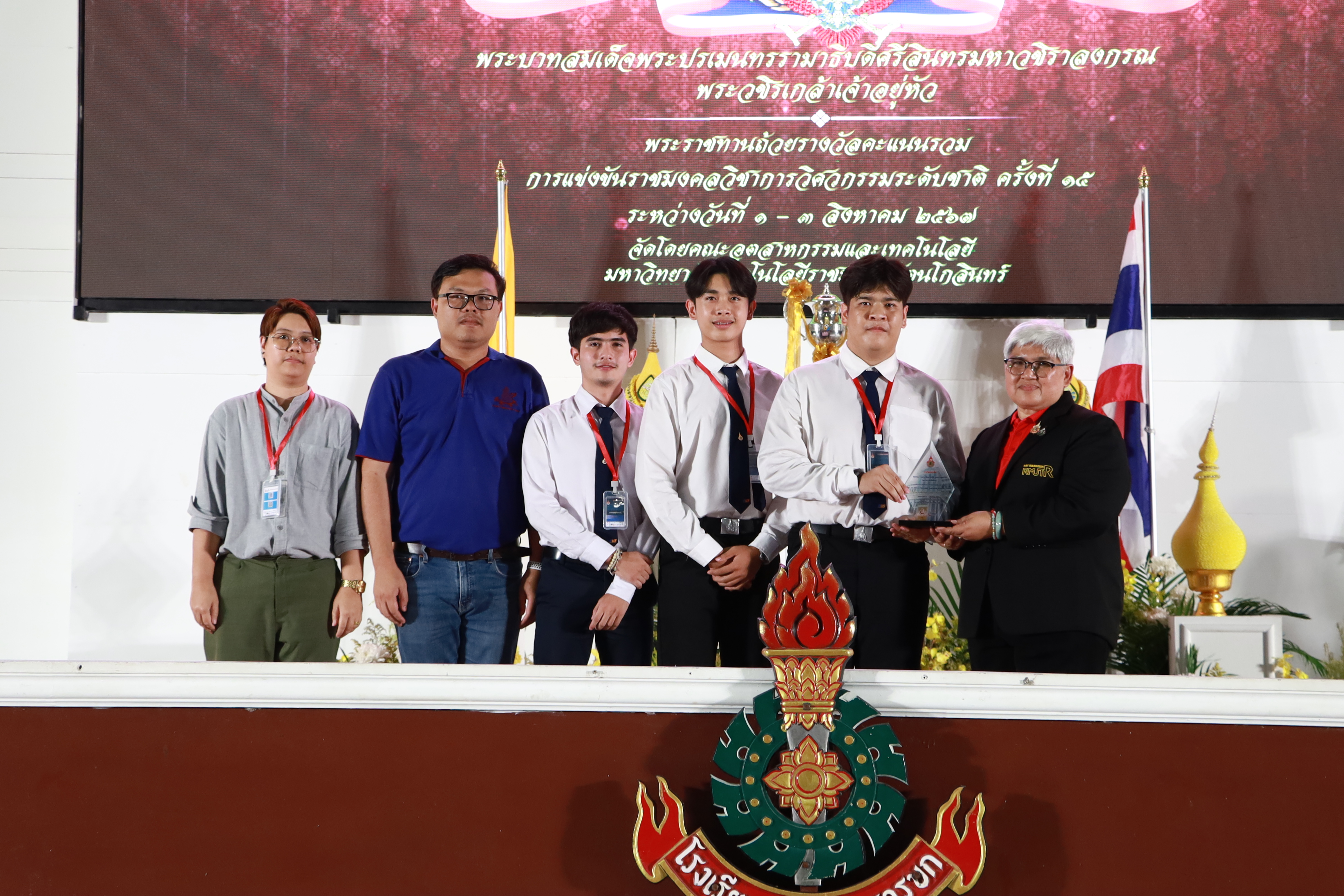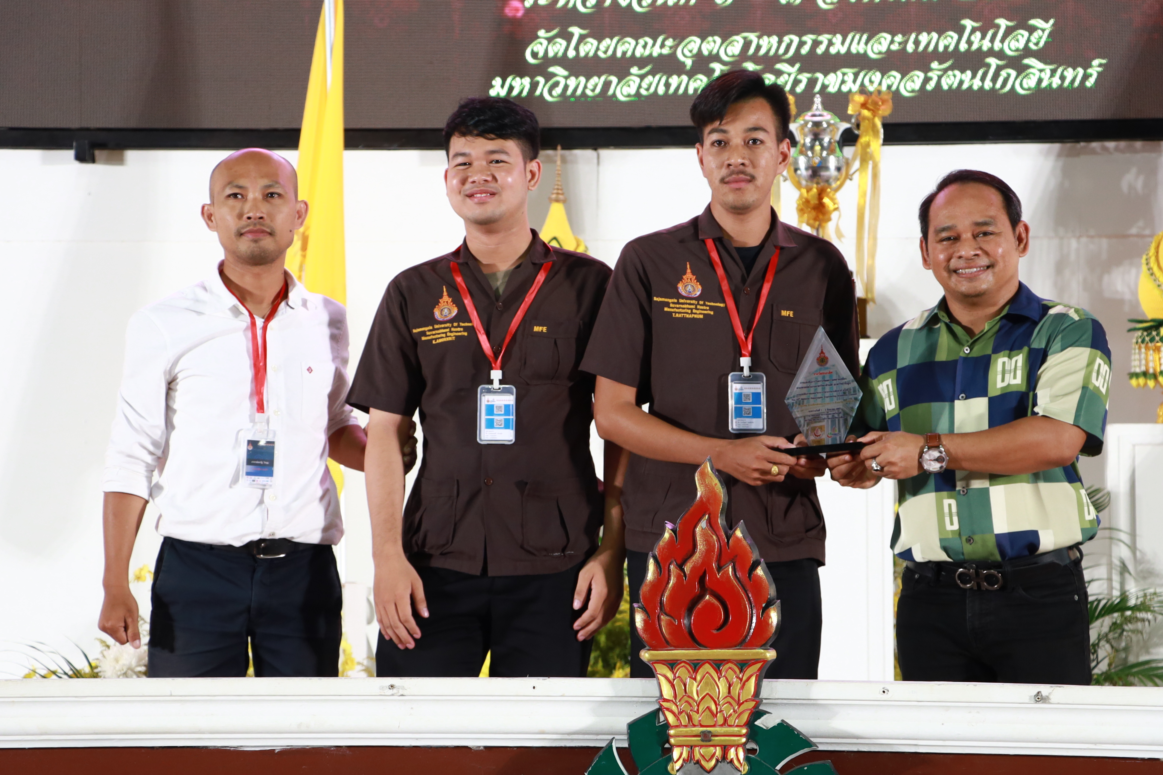 - ประเภทการแข่งขันออกแบบและพัฒนาระบบ IOT เพื่อสร้างนวัตกรเชื่องโยงนวัตกรรม สู่ฟาร์มชุมชน โดยนายชินกฤต เดชดำรงรักษ์ และ นายภาคิน พระแท่น นักศึกษาชั้นปีที่ 1 สาขาวิชาวิศวกรรมเมคคาทรอนิกส์ ซึ่งมีอาจารย์ ดร.ศรัณย์ ฉัตรธัญญกิจ เป็นอาจารย์ผู้ควบคุมทีม